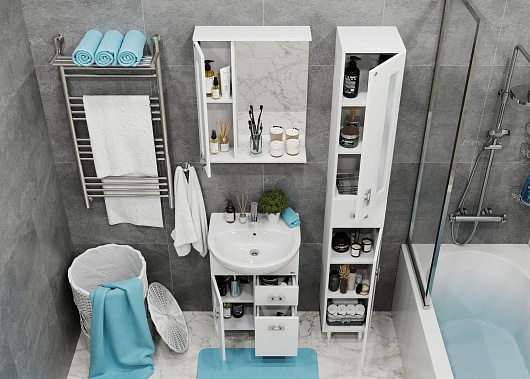 В комплекте: тумба, раковина, зеркальный шкаф, ножка (3 шт.).