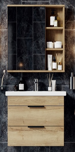 Исполнение комплекта реализовано в лофт-стиле, цвет покрытия – дуб галифакс. Подвесная раковина – фаянсовая, с защитой от перелива. Зеркальный шкаф включает в себя вместительные полочки, на которых можно разместить косметические принадлежности. Тумба под раковину имеет два отделения, которые будут идеальны для хранения полотенец, белья, сменной одежды и любых других вещей. Выдвижные фасады обладают плавным ходом и оптимальной вместительностью. Привлекательный дизайн сделает мебель для ванной Onika потрясающим вариантом для любителей современного образа.Зеркало «Легран 60.00У» — арт. 206071