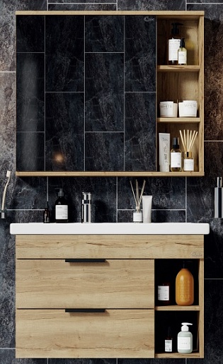 Комплектация: подвесная тумба с двумя выдвижными фасадами и полочками, умывальник ФОСТЕР-80 правый (Кirovit).