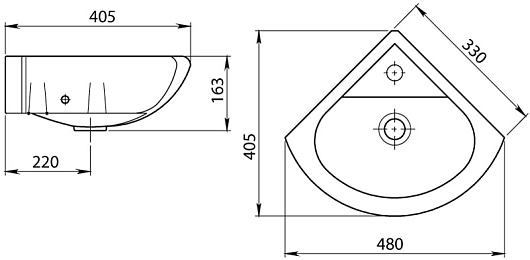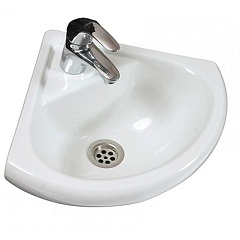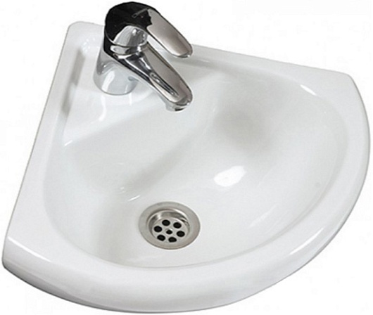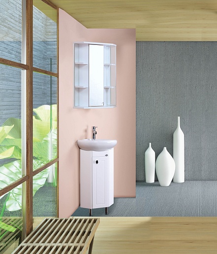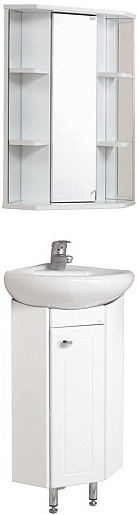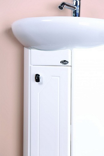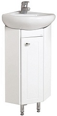 Комплектация: компактная угловая тумба с распашной дверцей, хромированная фурнитура, фасад из MDF, корпус — ЛДСП, фаянсовая раковина "Santeri Радиан 33".