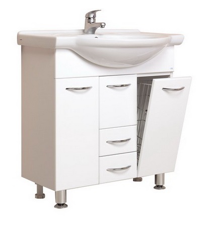 Комплектация: две распашные дверцы, отделение с откидной дверцей со встроенной бельевой корзиной, передние ножки — хром, задние их ПВХ, все ножки регулируются по высоте. Два выдвижных ящика, фасад из MDF, корпус — ЛДСП. Фаянсовая раковина "Сантек Байкал 75".