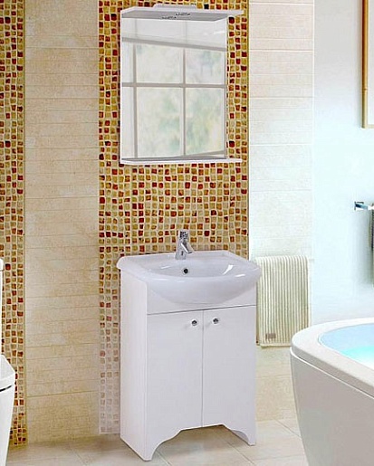 Комплектация: влагостойкое зеркальное полотно с полочкой и козырьком. Подсветка с галогеновой лампой мощностью 12w. Фасад и корпус из влагостойкого ЛДСП с глянцевым покрытием.