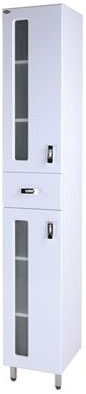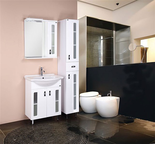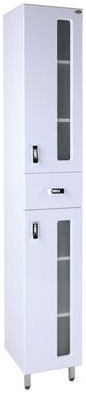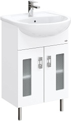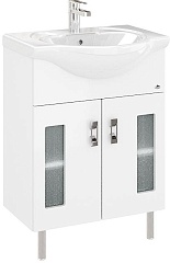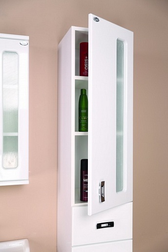 Описание: две распашные дверцы с вставками из матового стекла, выдвижной ящик. Фасад из MDF, корпус — ЛДСП, ножки регулируются по высоте. Ориентация универсальная.