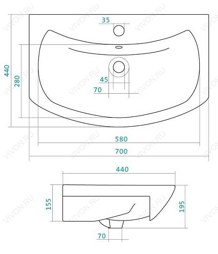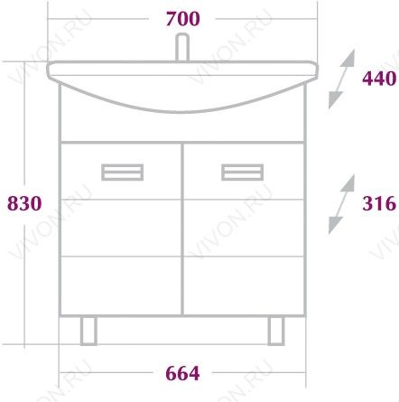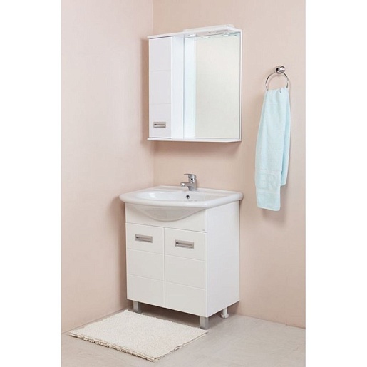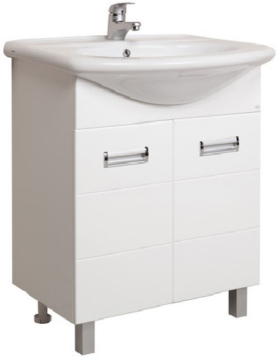 Описание: напольная тумба с двумя распашными дверцами, фасад и корпус из МДФ, фаянсовая раковина "Сантек Балтика 70", ножки регулируются по высоте.