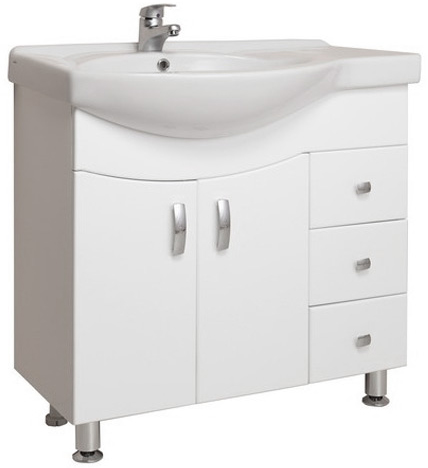 - тумба под раковину: 3 выдвижных ящика, распашные дверцы, полка внутренняя, ручки - металл (хром), ножки передние (регулируемые) - металл (хром), ножки задние (регулируемые) - пластик