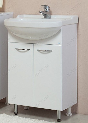 Комплектация: две распашные дверцы, хромированая фурнитура и передние ножки, задние ножки из ПВХ, все ножки регулируются по высоте. Фасад из MDF, корпус — ЛДСП, фаянсовая раковина "Della Классик 55".