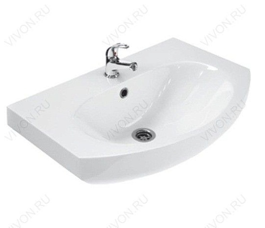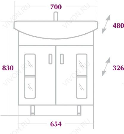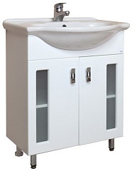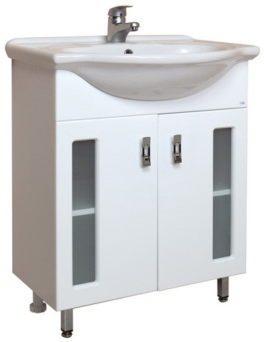 Комплектация: две распашные дверцы со вставками из матового стекла, хромированая фурнитура и передние ножки, задние ножки из ПВХ, все ножки регулируются по высоте. Фасад из MDF, корпус — ЛДСП, фаянсовая раковина "Эрика 70" с кольцом перелива.