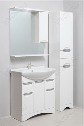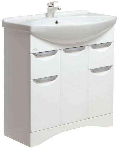 Описание: напольная тумба с тремя распашными дверцами и двумя выдвижными ящиками, фасады и корпус из MDF, фурнитура хром, фаянсовая раковина Лагуна 75 (Dreja).