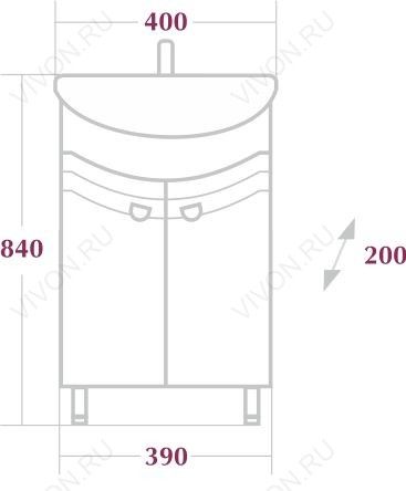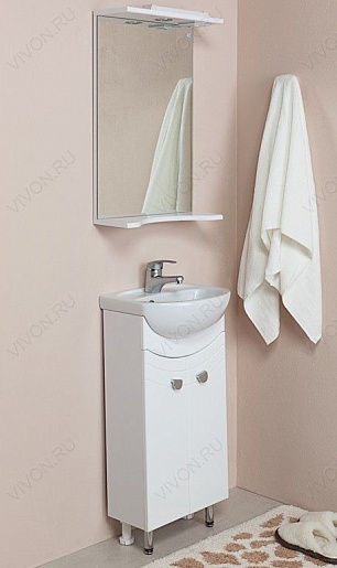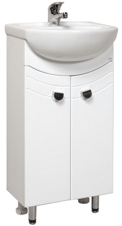 Комплектация: две распашные дверцы, хромированая фурнитура и 3 ножки, передние ножки, задняя ножка 1 штука из ПВХ, фасад из MDF, корпус — ЛДСП, фаянсовая раковина "Санита Манго 40". Благодаря небольшим габаритам подойдет для маленьких ванных комнат.