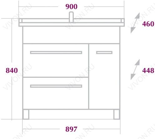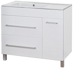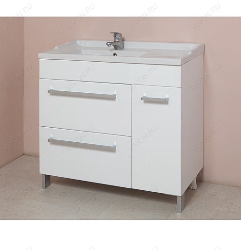 Комплектация: напольная тумба с двумя выдвижными ящиками и отделением с распашной дверцей, корпус и фасады из MDF. Фаянсовая раковина "Оnika 90 R", хромированая фурнитура. Ножки регулируются по высоте.