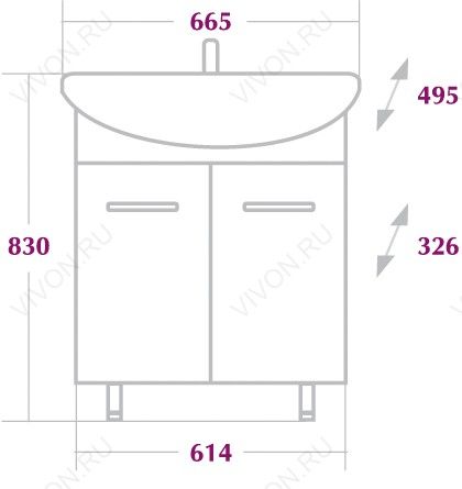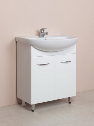 Комплектация: отделение с распашными дверцами, хромированая фурнитура, фасад из MDF, корпус — ЛДСП, фаянсовая раковина "Сантек Стелла 65".
