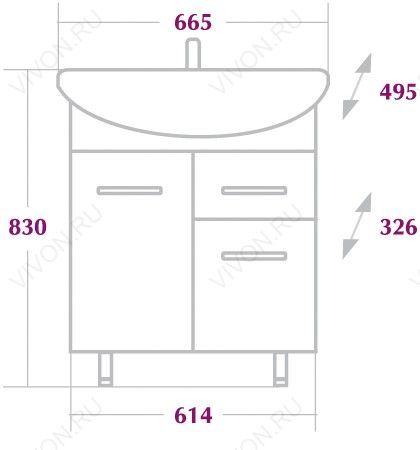 Комплектация: два отделения с распашными дверцами, выдвижной ящик, хромированая фурнитура, фасад из MDF, корпус — ЛДСП, фаянсовая раковина "Сантек Стелла 65".