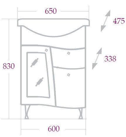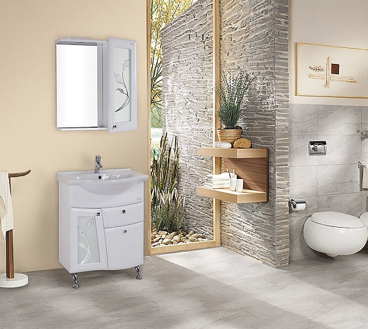 - тумба под раковину: выдвижной ящик, 2 распашных дверцы, 3 ручки (хром), 4 ножки. Одна из распашных дверц декорирована вставкой матового стекла с рисунком.