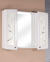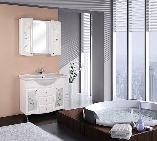 - тумба под раковину: 3 выдвижных ящика, 2 распашных дверцы, 5 ручек (хром), 4 ножки. Распашные дверцы декорированы вставкой матового стекла с рисунком.
