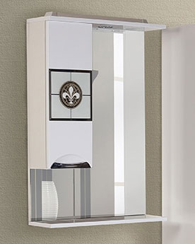 Комплектация: подвесной шкаф с влагостойким зеркальным полотном. Боковой шкафчик с распашной дверцей, козырьком и нижней полочкой. Внутренние отделение с полочками, дверца декорирована вставкой с рисунком. Хромированная фурнитура, фасад и корпус из МДФ.