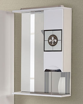 Комплектация: подвесной шкаф с влагостойким зеркальным полотном. Боковой шкафчик с распашной дверцей, козырьком и нижней полочкой. Внутренние отделение с полочками, дверца декорирована вставкой с рисунком. Хромированная фурнитура, фасад и корпус из МДФ.