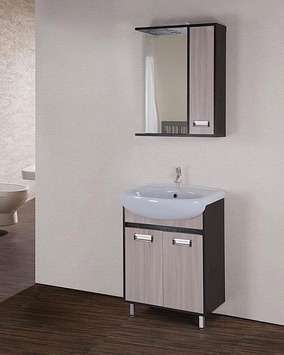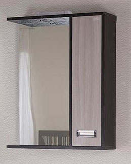 Комплектация: влагостойкое зеркальное полотно с боковым шкафчиком с распашной дверцей с механизмом доводчика. Внутренние отделение с полочками. Хромированная фурнитура, фасад и корпус из влагостойкого ЛДСП покрытого шпоном.