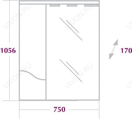 Комплектация: Зеркальное влагостойкое полотно, слева шкафчик с распашной дверцей и полочками. Два галогеновых светильника, выключатель, розетка. Фасад из МДФ, корпус — ЛДСП, хромированая фурнитура.