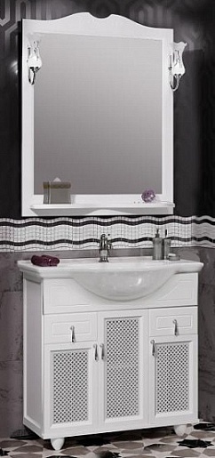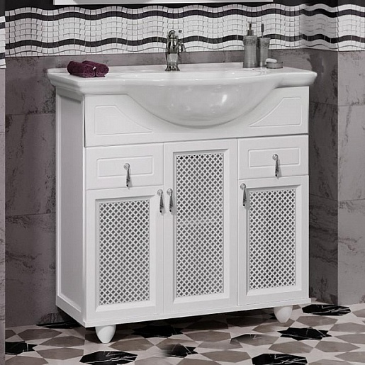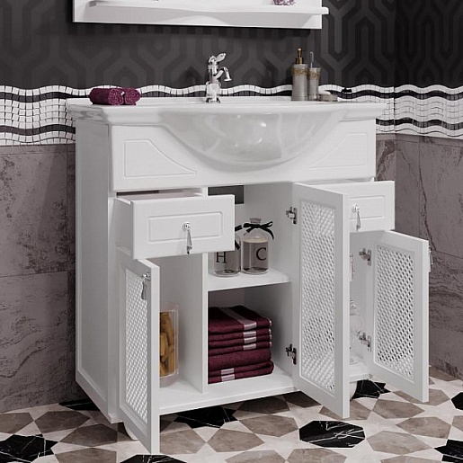Описание: тумба с тремя распашными дверцами, декорированными решеткой, и двумя выдвижными ящиками, выполнена из массива дерева. Дверцы и ящик оснащены высококачественной фурнитурой и изящными латунными ручками. В комплект входит керамическая раковина "Дрея 75" .