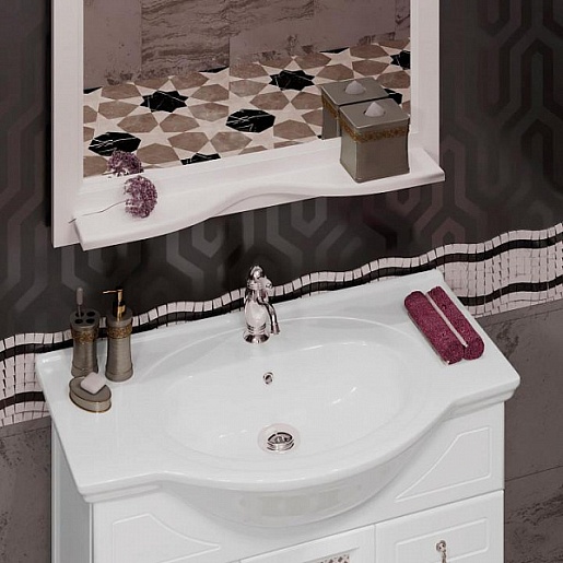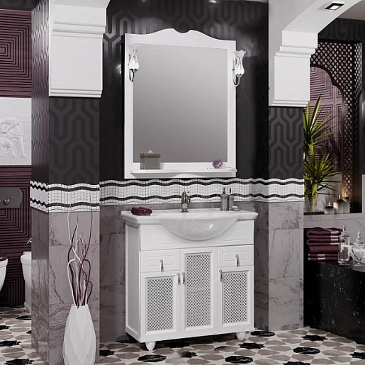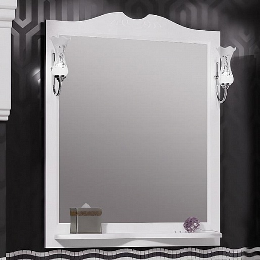 Описание: влагостойкое зеркальное полотно в раме из массива дерева, два классических светильника.
