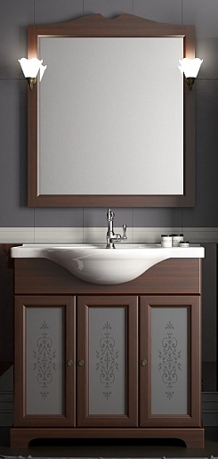 Описание: влагостойкое зеркальное полотно в раме из массива дерево, два классических светильника Кама.