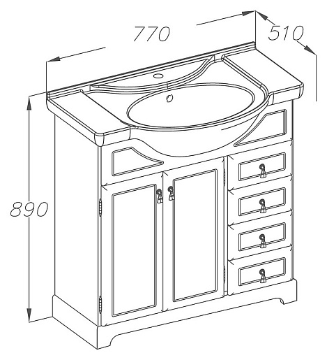 Описание: тумба с двумя распашными дверцами и ящиками, выполнена из массива бука. В комплект входит керамическая раковина "Дрея 75" .