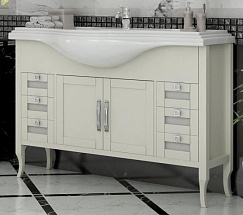 Описание: напольная тумба из массива бука с двумя распашными фасадами и шестью выдвижными ящиками. В комплект входит раковина Кировит "Классик 120".