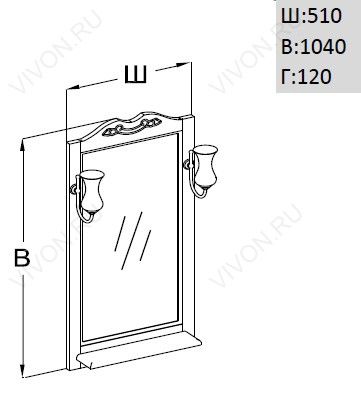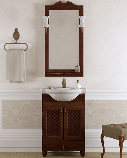 Описание: влагостойкое зеркальное полотно с подсветкой заключено в классическую, резную раму, тонированную в темный цвет.