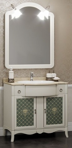 Описание: напольная тумба с двумя выдвижными ящиками и двумя распашными дверцами со стеклянными вставками, декорированными золотистой раскладкой, выполнена из массива бука. Эффект патины и бронзовая фурнитура подчеркивают классический стиль и сдержанный итальянский шик тумбы. В комплект входит раковина и столешница из натурального мрамора.