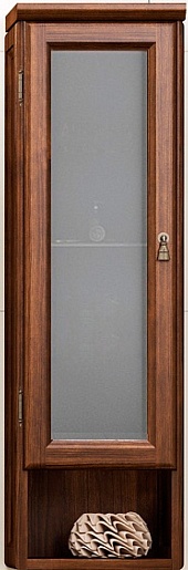 Описание: узкий подвесной шкаф-колонка для ванной с открытой нишей и застекленным распашным фасадом (петли слева). Внутреннее пространство оборудовано полкой из матового стекла.