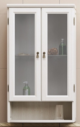 Описание: подвесной шкаф для ванной с открытой нишей и двумя застекленными распашными фасадами. Внутреннее пространство оборудовано двумя полками из матового стекла.