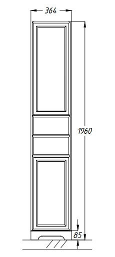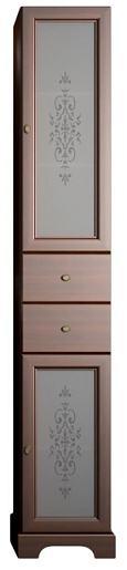 Описание: напольный пенал для ванной с распашными фасадами, декорированными вставками из стекла с узором, выдвижными ящиками в центре. Внутренне пространство оснащено полками. Пенал выполнен из массива бука.