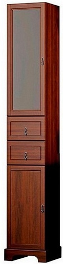 Описание: пенал для ванной с выдвижными ящиками и с распашными фасадами, декорирован вставкой из стекла. Внутреннее пространство оснащено полками. Пенал выполнен из массива бука.