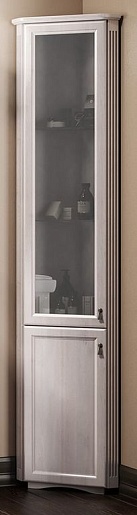 Описание: угловой напольный пенал с двумя распашными дверцами (петли слева) выполнен из массива бука. Верхний дверной фасад декорирован вставкой из матового стекла, внутреннее пространство оборудовано двумя вкладными полками.