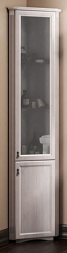 Описание: угловой напольный пенал с двумя распашными дверцами (петли справа) выполнен из массива бука. Верхний дверной фасад декорирован вставкой из матового стекла, внутреннее пространство оборудовано двумя вкладными полками.