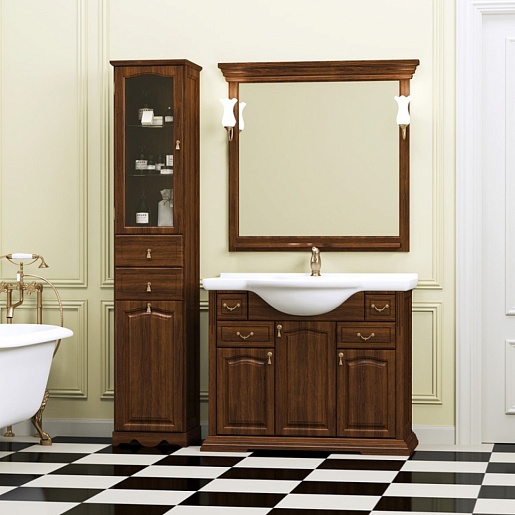 Описание: напольный пенал с двумя выдвижными ящиками и распашными фасадами, декорированной полупрозрачным стеклом. Пенал выполнен из массива бука, тонированного в темный цвет. Верхнее отделение оснащено двумя полками для удобства организации хранения.