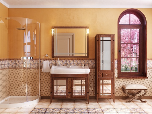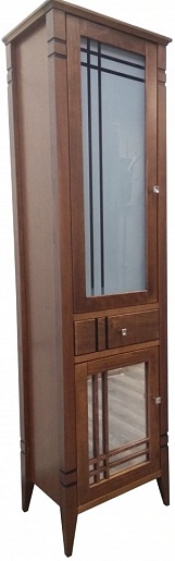 Описание: напольный пенал с ящиком и распашными фасадами, декорированными стеклом. Пенал выполнен из массива бука, тонированного в темный цвет. Отделения оснащены вкладными полками для удобства организации хранения.