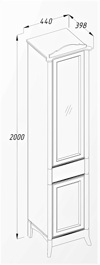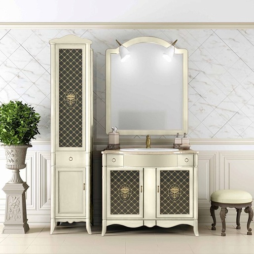 Описание: напольный пенал для ванной с двумя распашными дверцами (петли слева), верхняя из которых декорирована вставкой из стекла с декоративной золотистой раскладкой и медальоном. В центре расположен выдвижной ящик для хранения мелочей. Пенал выполнен из массива бука.