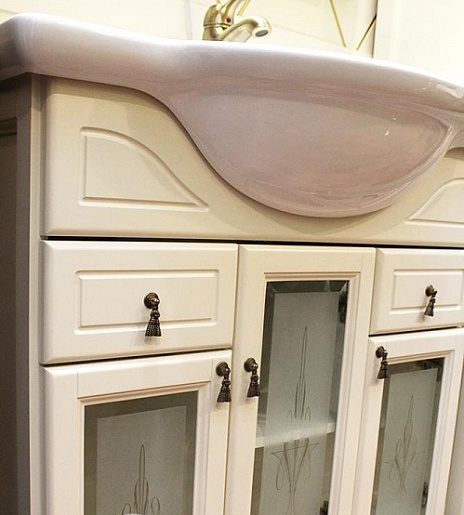 - Тумба под раковину напольная, массив бука, распашные фасады с художественным стеклом, выдвижные ящики.