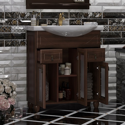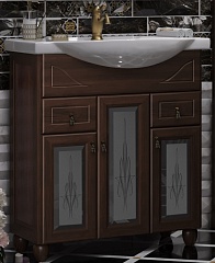 - Тумба под раковину напольная Тибет 75: массив бука, распашные фасады с художественным стеклом, выдвижные ящики, фурнитура - бронза.