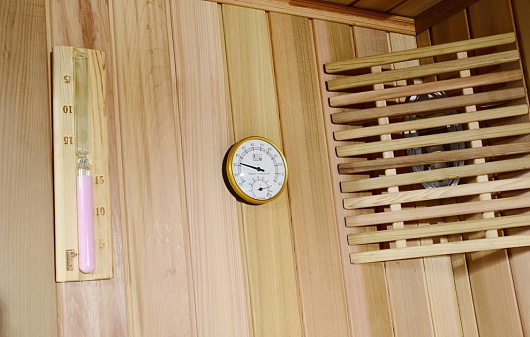 - Финская сауна: печка Harvia, банный камень 20 кг, скамья, гигрометр, песочные часы, абажур, шайка, черпак, датчик температуры.