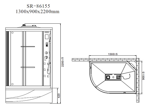 - стекла примыкающие к стенам цвет "Smoky white", остальные прозрачные, толщина 6 мм.