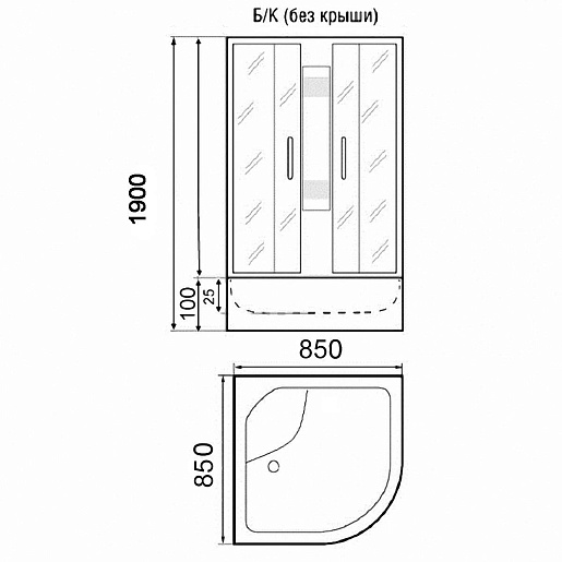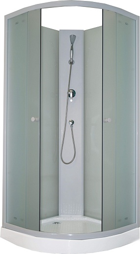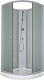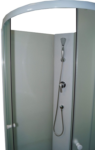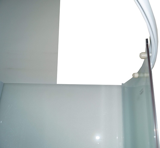 Полукруглая форма кабины предназначена для встраивания кабины в угол комнаты, что позволит сэкономить свободное пространство внутри ванной. Небольшие размеры кабины позволили исключить из конструкции центральный столб.