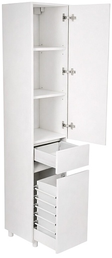 - Система хранения: 1 распашная дверка в верхней части корпуса, выдвижной ящик, выдвижная бельевая корзина.