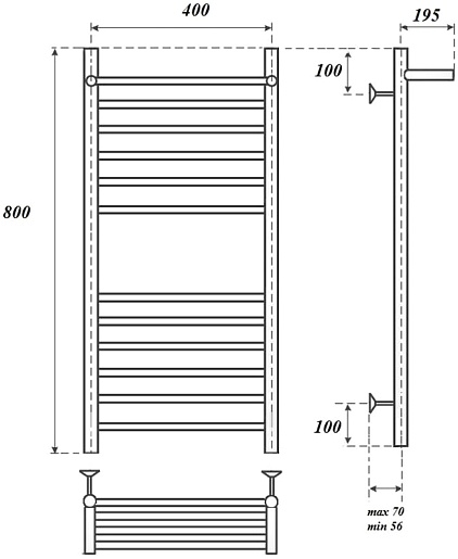 Комплектация: полотенцесушитель, телескопическое крепление к стене (4 шт.), ТЭН с терморегулятором.
