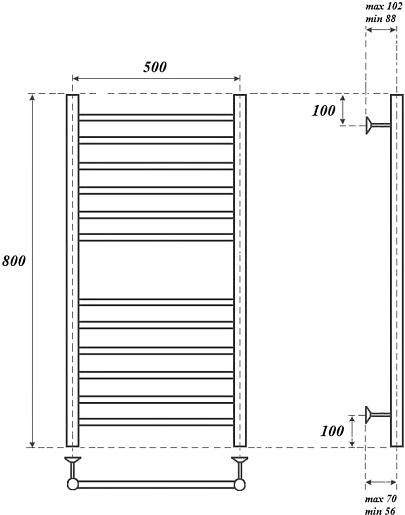 Комплектация: полотенцесушитель, телескопическое крепление к стене (4 шт.), ТЭН с терморегулятором.