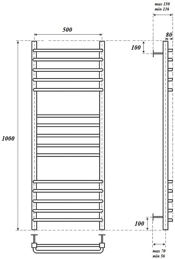 Комплектация: полотенцесушитель, телескопическое крепление к стене (4 шт.), ТЭН с терморегулятором.