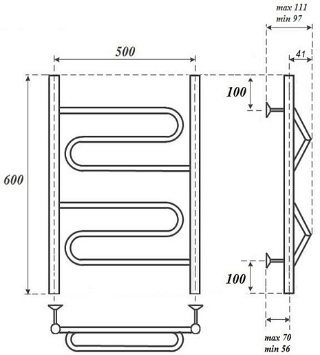 Комплектация: полотенцесушитель, телескопическое крепление к стене (4 шт.), ТЭН с терморегулятором.