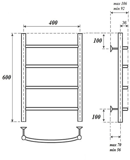 Комплектация: полотенцесушитель, телескопическое крепление к стене (4 шт.), ТЭН с терморегулятором.
