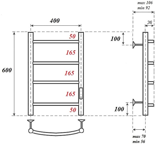 Комплектация: полотенцесушитель, телескопическое крепление к стене (4 шт.), сетевой кабель.